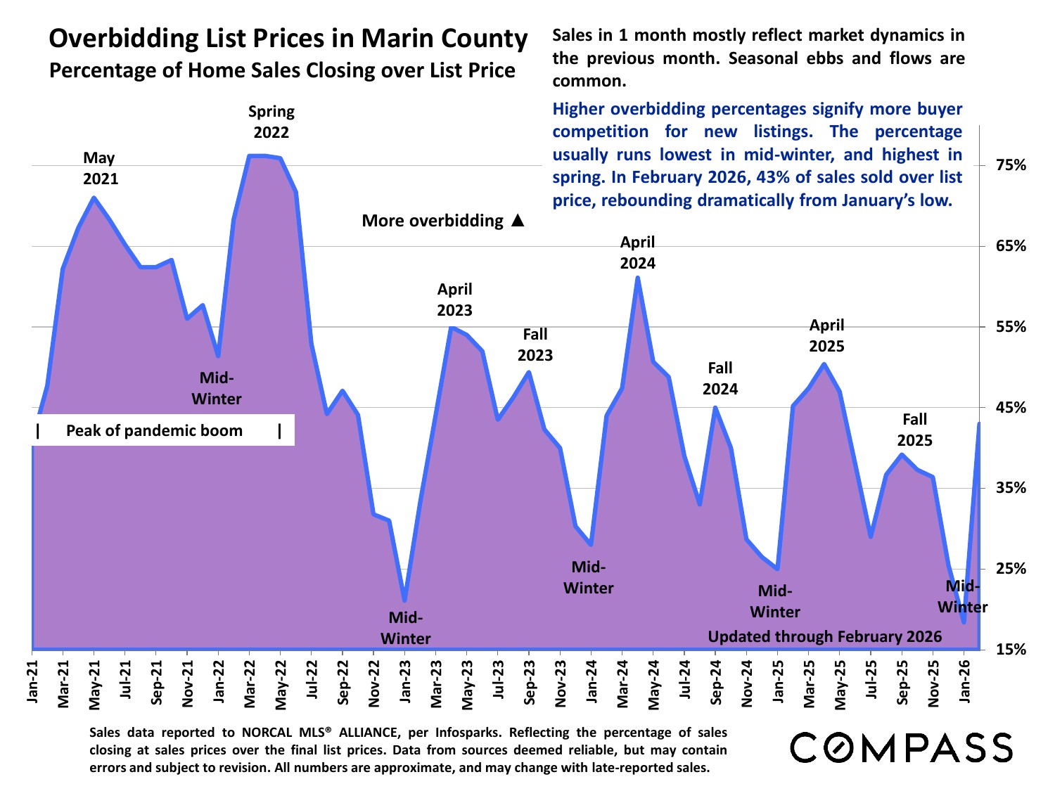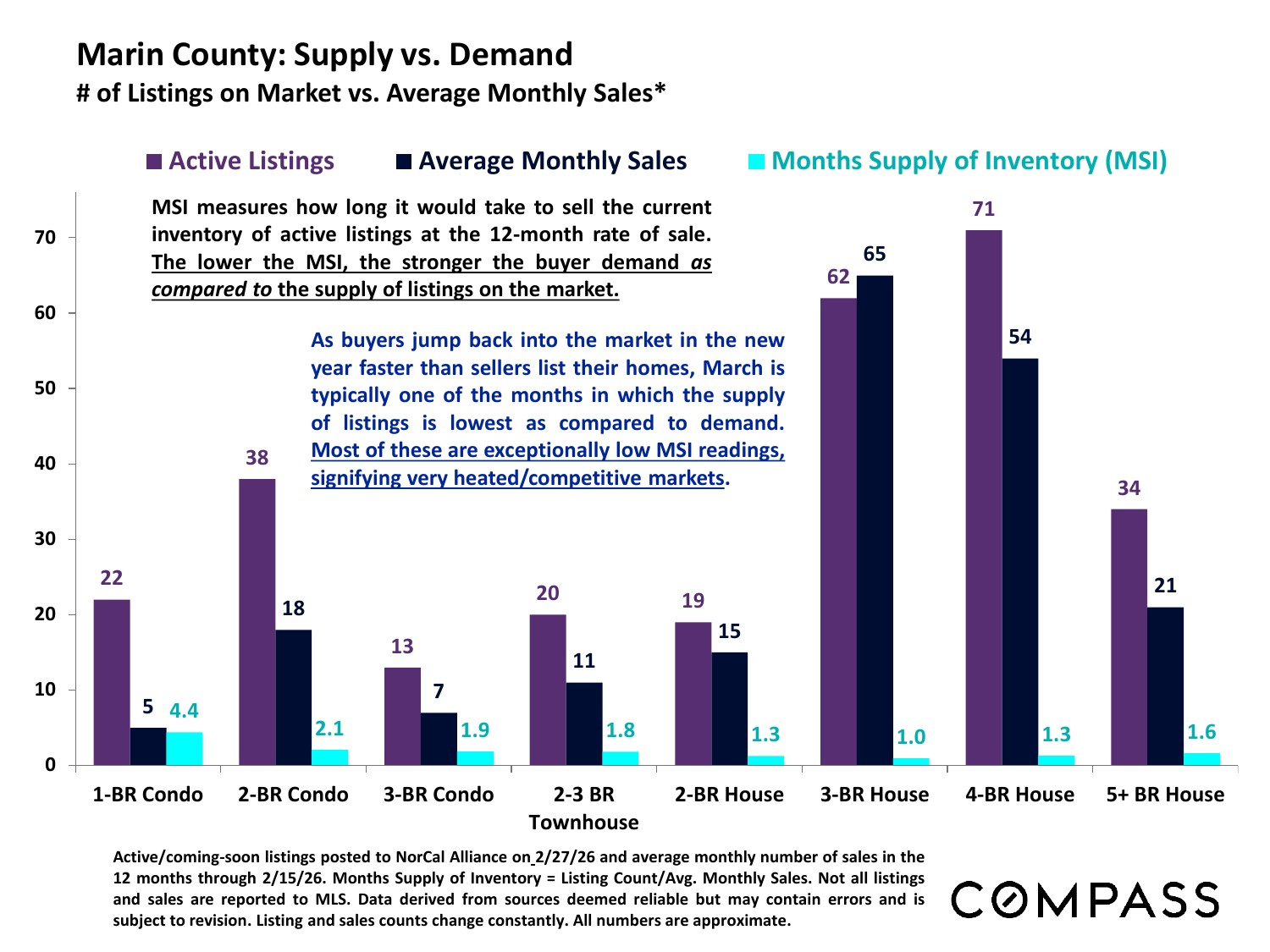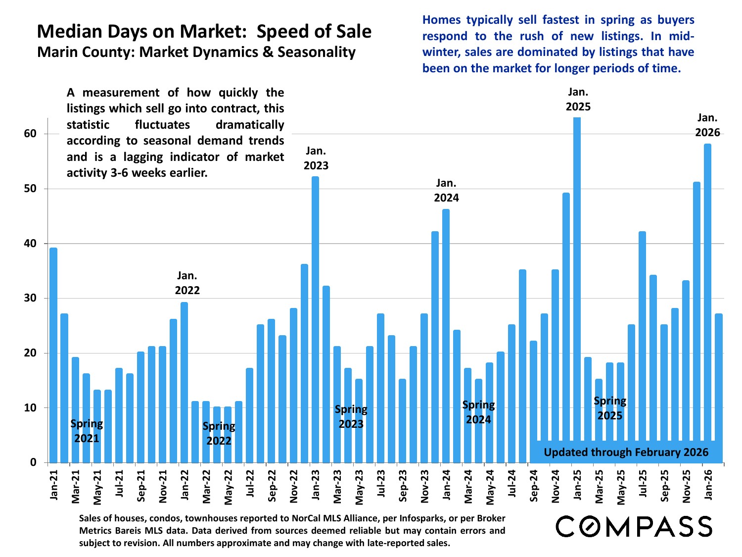 Moving into spring, rising buyer demand vs. an inadequate supply of homes for sale is creating a rapidly heating market characterized by increasing buyer competition, faster sales and more overbidding of asking price. The upcoming months are typically the most active of the year and on current trends, conditions are expected to generate continuing upward pressure on home values. Median home sales prices often hit their calendar-year highs in spring, due to the severe imbalance between supply and demand, as well as a seasonal surge in luxury home sales.